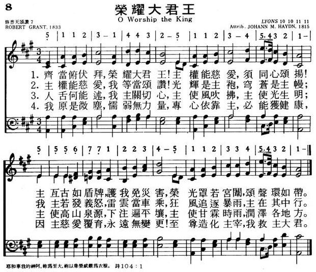 1833年葛莱特读纪思翻译的诗篇104篇,启发了他写这首诗。许多权威人士称它为敬拜神的模范圣诗,它赞美神的大能、恩典、眷顾和信实,全诗的韵律优美。他歌颂神为王、是造物主、是保护者,而人仅是微尘而已。