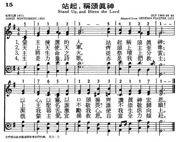 这首「站起.称颂真神」作于 1824 年,是特别为英国 Sheffield 地区的主日学周年纪念写的。乃根据尼希米记 9:5:「你们要站起来称颂耶和华你们的神永世无尽。耶和华阿,祢荣耀之名,是应当称颂的,超乎一切称颂和赞美。」的经文为背景。