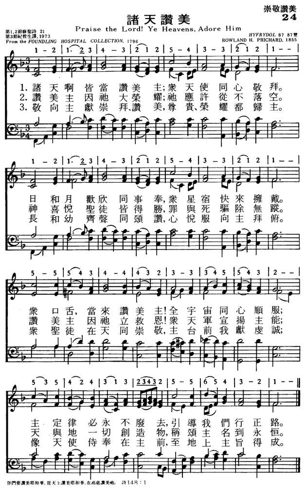 1.诸天啊皆当赞美主;众天使同心敬拜。