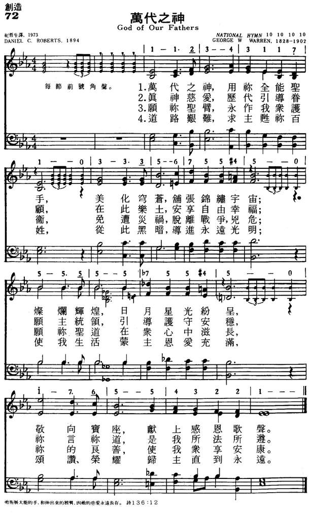 十六年后,圣公会圣诗重编时,请纽约圣多马教堂的司琴华伦(George William Warren, 1828-1902)另配一曲以号角声为开始。 华伦的谱更受欢迎,歌词和旋律中充满了爱国的情操。