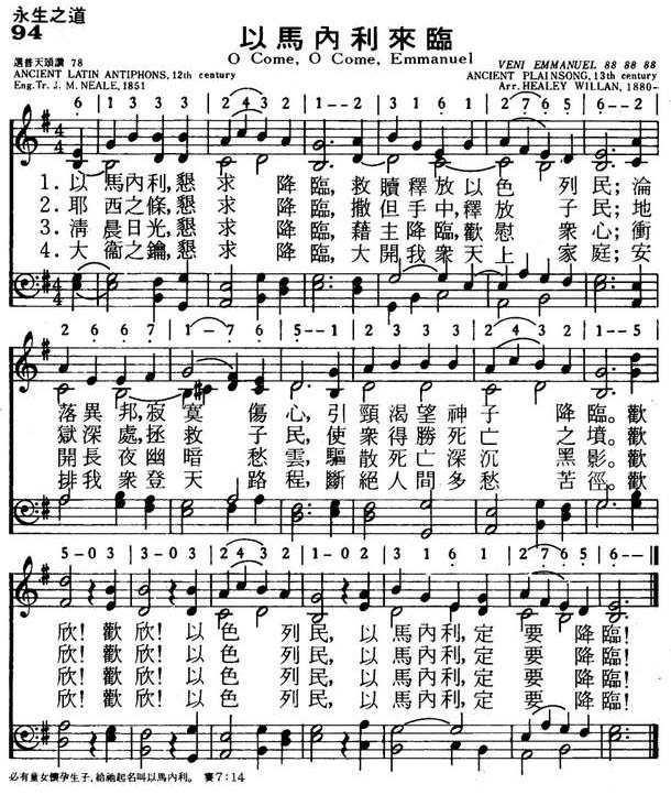 《新编赞美诗》收录在第66首《以马内利来临歌》