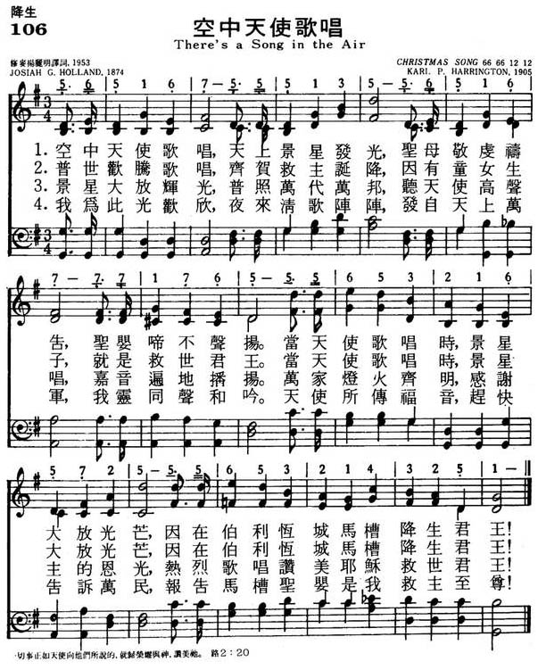 这首「空中天使歌唱」 1874 年首次刊印于主日学校专辑内。 1881 年 10 月 12 日逝世于纽约。本诗以描写基督的诞生开始,以信徒对基督的诞生之反应作结束。第 1 , 2 节强调基督降生这件事实,第 3 、 4 节写这事实的效果。目前所用的曲调作者为 Karl P. Harrington ,是一位杰出的拉丁文教授、作曲家、风琴师及诗班指挥。在他 84 岁高龄时,仍是一位活跃的教会风琴师及诗班指挥。