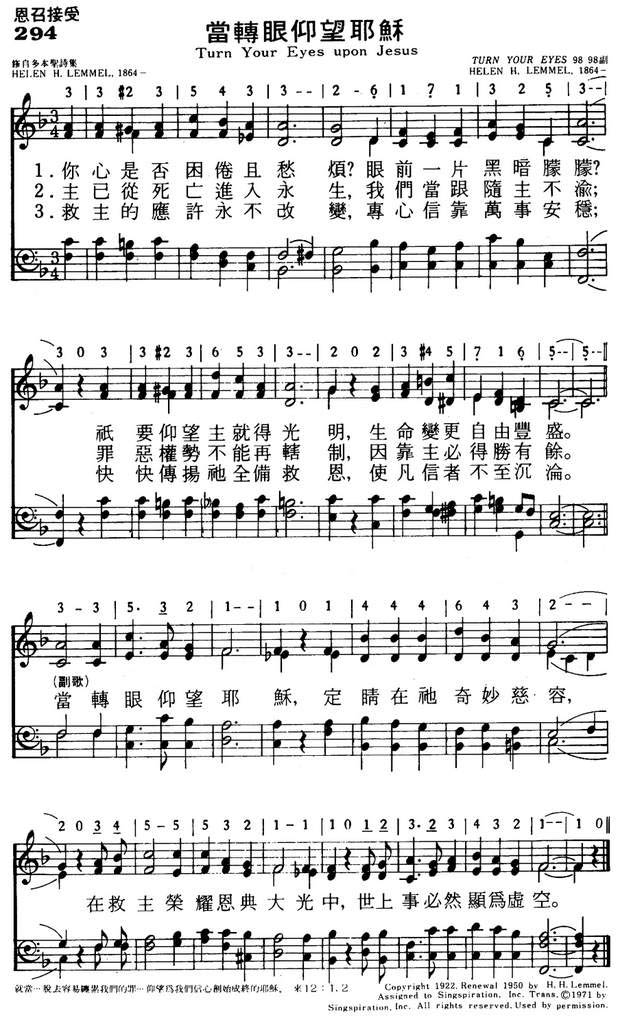 副歌:当转眼仰望耶稣,定睛在他奇妙慈容,