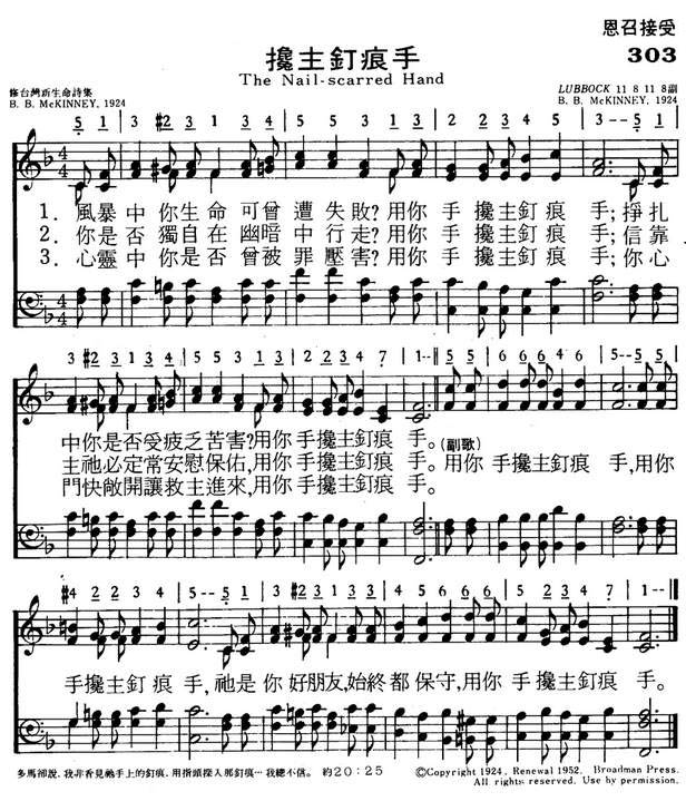 用你手搀主钉痕手;信靠主祂必定常安慰保佑,