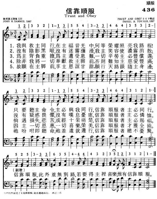 有一位年长的基督徒,自幼信主,热心事奉。某冬他因久咳就医,医生诊断是肺癌。当时他难以接受患此绝症,平时深信神在凡事上都有美意,但切身体验时,不免 抱怨问神为什么?在这段苦恼的日子中,他只有唱圣诗才能稍安。有一天他唱到《信靠顺服》时,恍然悟到,不能口唱而心不和,自许是基督精兵,岂能临阵作逃 兵?当即心中充满平安,确信无论是生是死,都在神的旨意中,他喜乐平安的心情感动了他尚未信主的子女和医院中其他的病人。
