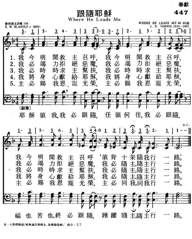 耶稣领我,我必跟随,任领何往,我必跟随,