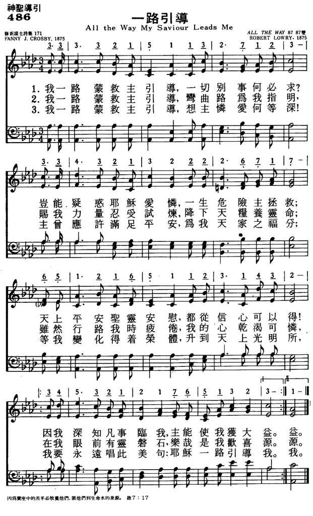 芬妮成名后虽收入较丰,她仍过着简朴的生活,将她所得赒济穷人。她的朋友劝她迁离贫民窟,但她喜欢晚上邀邻居来她家,为他们唱歌,弹吉他。1874年秋,有一天芬妮发现自己没有足够的钱缴房租,她挚诚地祷告,求神供应。没多久,有一位陌生客来访,客人离去握别时,递给她一纸,这正是芬妮所需的五元钱。当天下午芬妮怀着感恩的心写下了这首圣诗。
