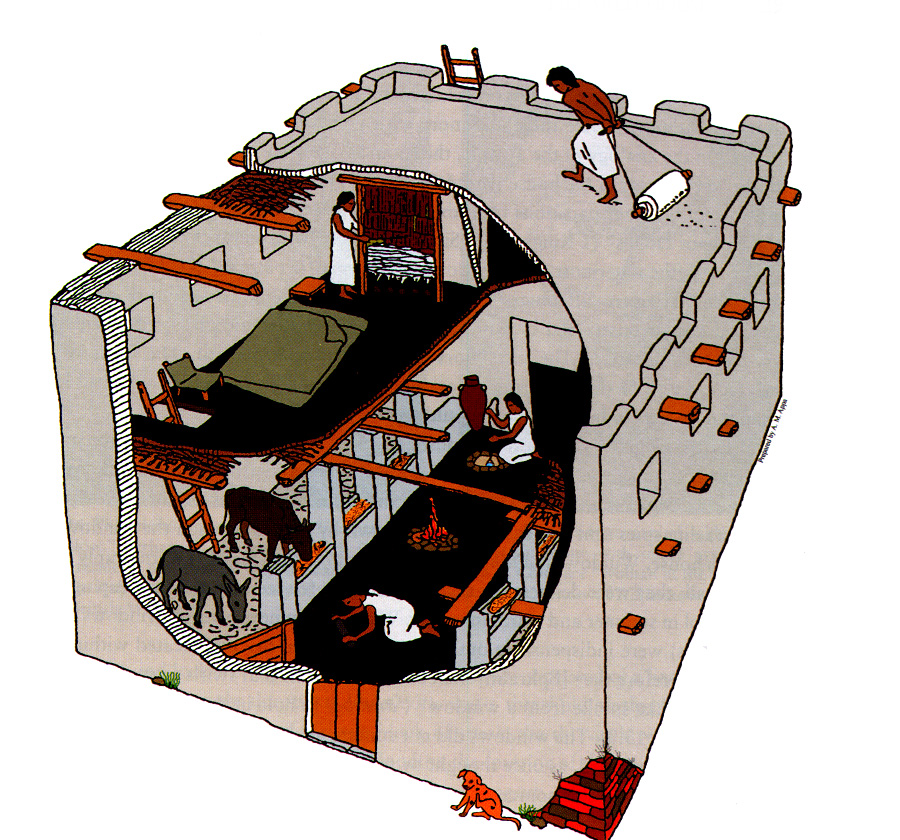 上图:主前1200年左右典型的以色列房子,男主人正在用滚筒刷屋顶。屋顶上有矮墙,温暖的天气可以用作额外的吃饭、工作、睡觉的场所。雨季之后,屋顶需要重新用灰泥刷一遍。