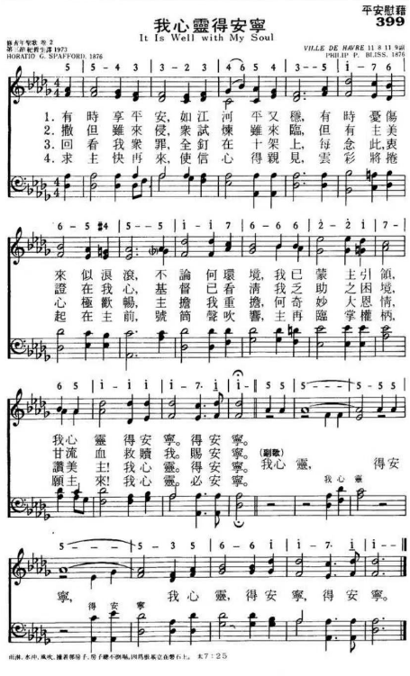 “我心灵,得安宁”这首诗歌常用于基督徒丧礼。作词者是史派福(Horatio G. Spafford),他是个很成功、为人所羡慕的律师,同时也是个很虔诚的基督徒。然而就在1871年的芝加哥大火发生的前几个月,史派福在密西根湖畔大量投资在房地产上。就这样,他的投资全毁于这次的大灾难里!接着,他本希望让他的太太与四个女儿能好好地休息,而且他也希望能帮助一些教会活动,便安排他的家人在1873年11月来一趟欧洲之旅。他在出发前一刻,因为业务上的需要而必须留下来,于是他只好送他太太与四个女儿依原订的船期,登上汽船前往欧洲;而他自己则预计在几天之后,处理完相关业务,再前往欧洲与妻女会合。但是,在11月22日,这一艘由美国前往欧洲的船,被另一艘英国轮船撞上,在短短的12分钟里就沉没了!几天之后,海难的生还者终于在韦尔斯的卡迪夫(Cardiff, Wales)登岸;史派福太太给她先生发了一封电报:“只有自己获救(Saved alone)”!史派福随即乘船前去与他挚爱的妻子会合,当他搭船来到他四个女儿溺毙的海域附近时,他写下了这一段描述他自己内心深沉悲恸的歌词:“忧伤来似浪滚!(When sorrows like sea billows roll……)”