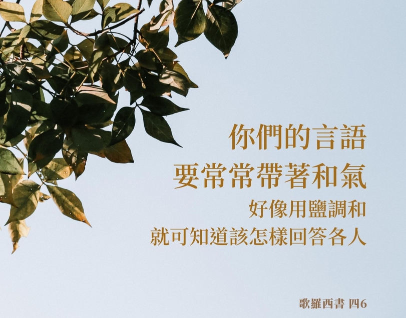 你还记得我们讨论过,用真理当作盐来调和我们的孩子吗?然而,孩子并不是我们生命中惟一需要盐的人!你可以在每一个你所遇见的人身上从事盐的事奉,也就是鼓励人的事奉。若你的“言语常常带着和气,好像用盐调和”(参考歌罗西书四章6节),就能服事每一个与你相遇的人。你的生命和嘴唇会不断地挑旺和激励在属天道路上与你同行的人。就像我们的弥赛亚,你将可以“用言语扶助疲乏的人”(以赛亚书五十章4节)。