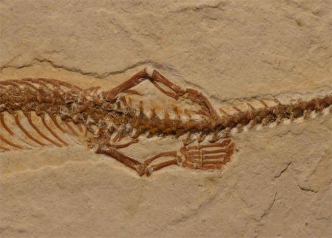 上图:巴西发现的古代Tetrapodophis四足蛇化石。从解剖学上看,现代蛇以前应该是长腿的,少数蟒蛇中依然可以找到髋骨和后腿的痕迹。有研究者认为,蛇的很多骨头形成很晚,当胚胎发育完成时,有些骨头还未长好或根本没有形成,因此现代蛇没有腿。