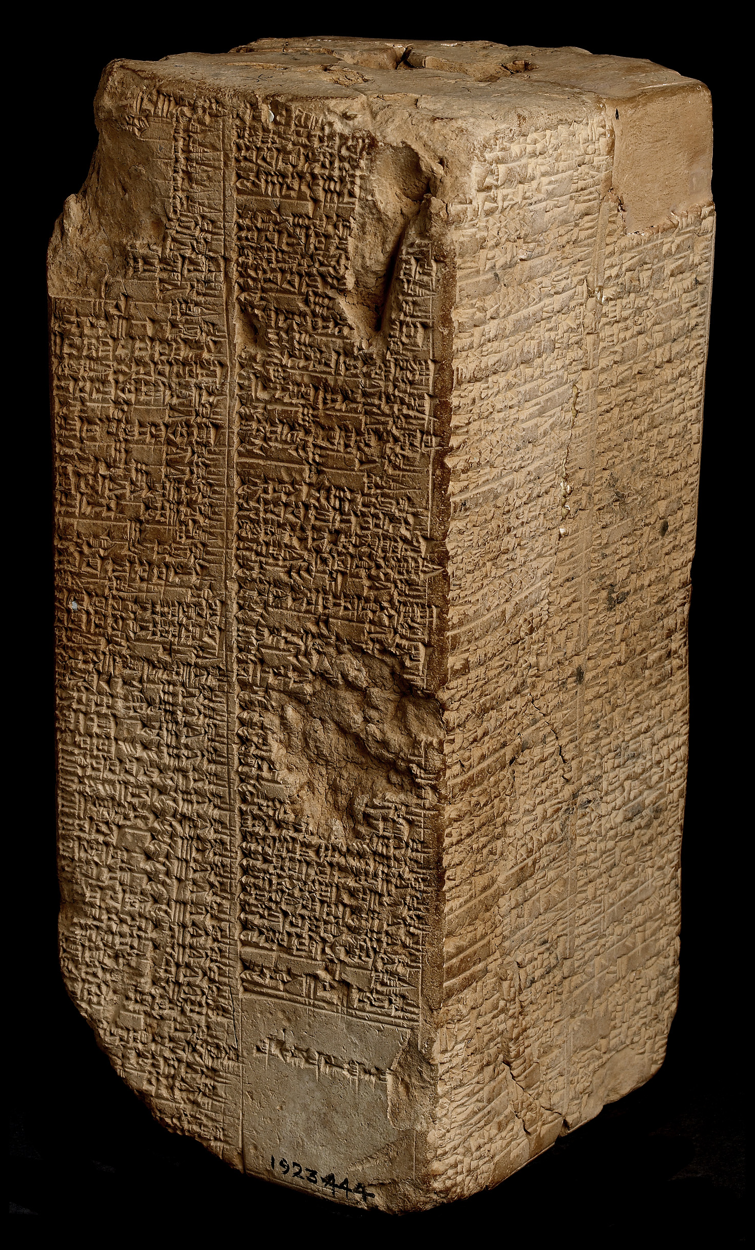 上图:主前2000-1800年的韦尔德-布伦德尔立柱(Weld-Blundell Prism),上面用楔形文字刻有《苏美尔王表 The Sumerian King List》,现存于英国牛津大学阿什莫林博物馆艺术与考古博物馆(Ashmolean Museum of Art and Archaeology)。《苏美尔王表》是一份古代文献,发现于美索不达米亚各地,使用苏美尔语书写,目前发现总共有16份,内容基本相同。上面所列的洪水之前的每个王都统治了2-4万年,洪水之后的每个王统治的时间从1200年逐渐降到几年。虽然《苏美尔王表》中有许多夸大的地方,但洪水之前和洪水之后的年龄的相差比例,与创世记的家谱接近。