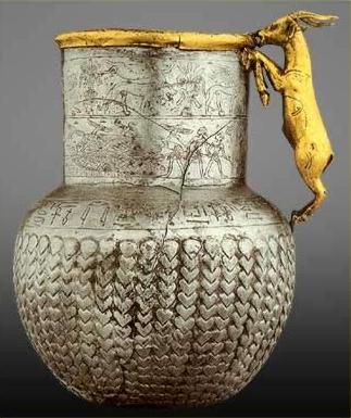 上图:主前13世纪古埃及的银瓶,出土于Tell Basta。钱币要到主前六世纪才发明,古代的贸易是用贵金属、宝石、香料、香以及其他奢侈品按重量以货易货。银子在古代世界每个地方都是很普遍的贸易品,埃及没有天然银矿,所以银子很受欢迎。