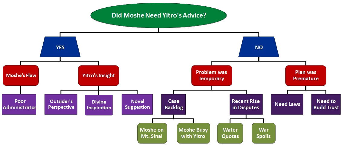 上图:在犹太人的妥拉课程中,对叶忒罗的建议提出的思考题:如果叶忒罗的建议是必要的,那么摩西看起来岂不很愚蠢,竟然不懂得自己解决问题?如果叶忒罗的建议是没有必要的,为什么摩西还要采纳他的建议?对于这一疑问,犹太拉比们提出了各种假设和解释。但如果撇开各种假设,完全根据上下文,那只能认为叶忒罗的建议是没有必要的。