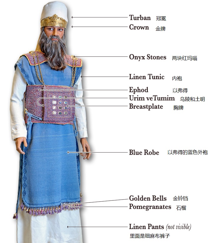 【出二十八4】「所要做的就是胸牌、以弗得、外袍、杂色的内袍、冠冕、腰带,使你哥哥亚伦和他儿子穿这圣服,可以给我供祭司的职分。」
