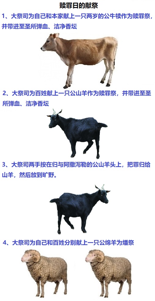 - 「归与耶和华的羊」(9节)是为了洁净「圣所和会幕并坛」,「归与阿撒泻勒的羊」(10节)是为了「担当他们一切的罪孽,带到无人之地」(22节)。平时大祭司都是用一只手按「一4,三2,四4、24」,现在却「两手按在羊头上」(21节),表示郑重地「承认以色列人诸般的罪孽过犯」(21节),并把「一切的罪愆」都归到这只活羊身上,好让罪远离百姓。因此,赎罪日所预表的是神彻底的救赎,因为赎罪祭和赎愆祭只能除去罪的影响、赦免罪的刑罚,但赎罪日「归与阿撒泻勒的羊」却「要担当他们一切的罪孽,带到无人之地」:「东离西有多远,祂叫我们的过犯离我们也有多远」(诗一百零三12),祂「又将我们的一切罪投于深海」(弥七19)。