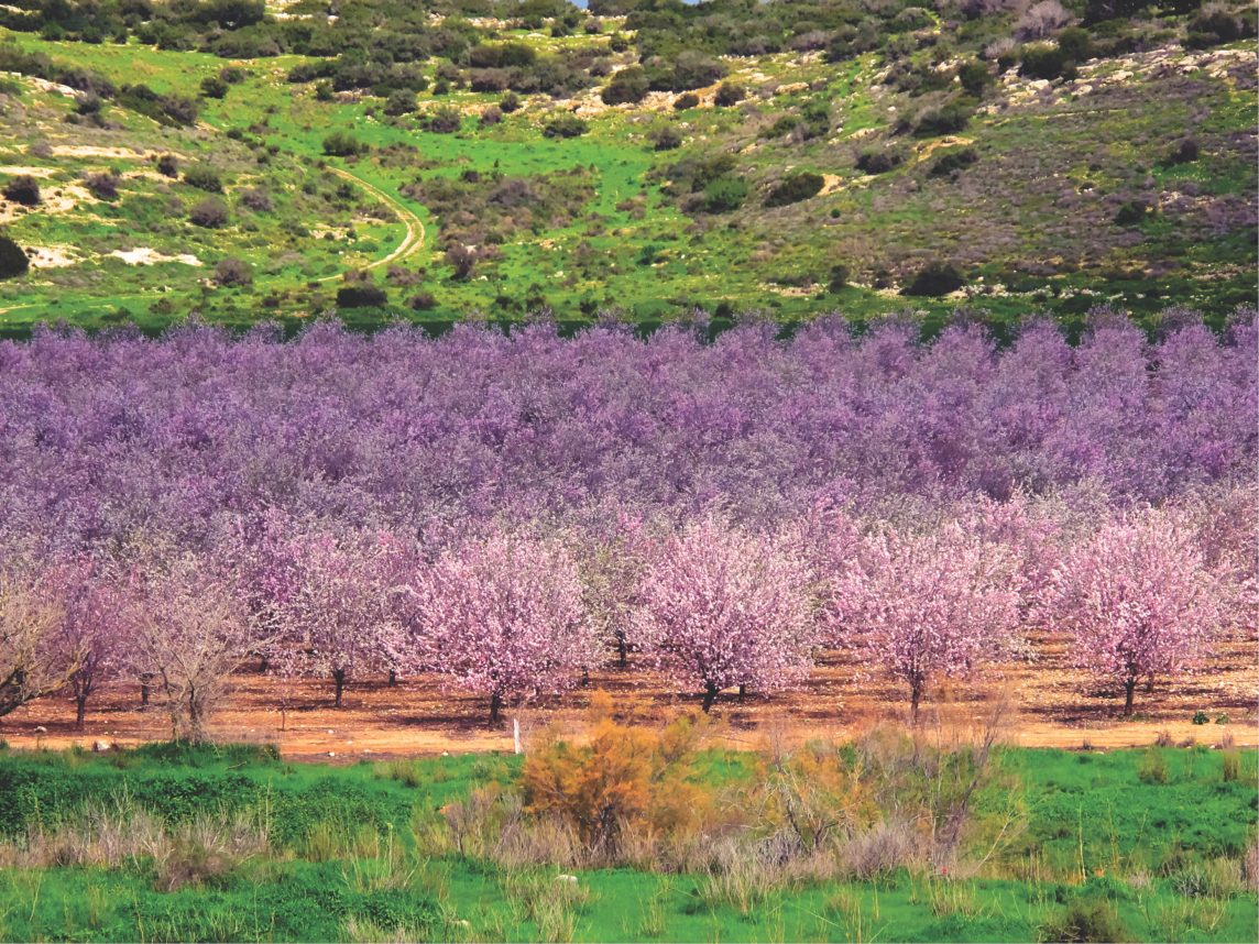 上图:在大卫打败歌利亚的以拉谷,每年早春杏花盛开。以色列的杏树就是扁桃树(Prunus amygdalus),每年阳历1、2月间开粉红色或白色的花,花有5瓣,先开花后长叶,是当地春天最早开花的树。杏树的树形、初熟的果实与桃树相似,成熟后果实会裂开,露出其中的核,核里就是杏仁。