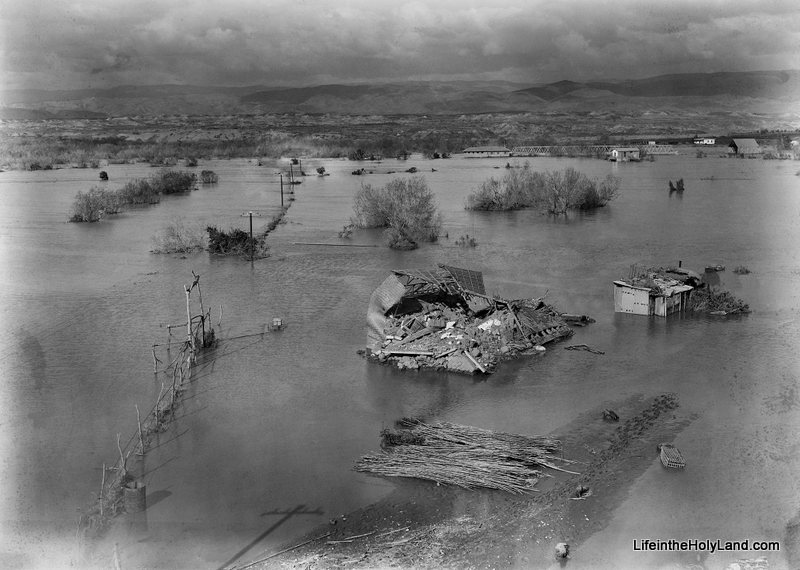 上图:1935年2月耶利哥附近艾伦比桥(Allenby Bridge)的约旦河宽阔河面,水面已经接近艾伦比桥面,印证了「约旦河水在收割的日子涨过两岸」(书三15)。由于两岸的过度抽取,现代约旦河的河面已经大大变窄。根据2010年耶路撒冷邮报的报道,约旦河的年水量只有100年前的3%:20世纪初的年流量是13亿立方米,现在的年流量只有3千万立方米。