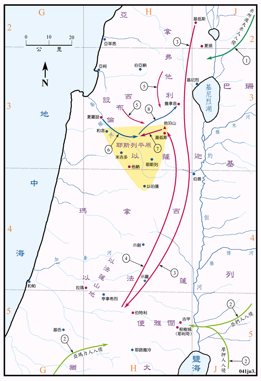 上图:士师俄陀聂、以笏和底波拉:1、美索不达米亚人入侵,使以色列人服事了他们八年,俄陀聂兴起拯救,国中平静了四十年(士三7-11);2、摩押人招聚了亚扪人和亚玛力人入侵,使以色列人服事了他们十八年,以笏兴起拯救,国中太平了八十年(士三12-28);3、迦南人夏琐王欺压以色列人二十年,底波拉作以色列人的士师,召拿弗他利的基低斯的巴拉到伯特利和拉玛附近她的家中,令他攻击夏琐王(士四1-7);4、底波拉和巴拉同去基低斯(士四8-9);5、巴拉召集西布伦人和拿弗他利人、以萨迦人共一万人到基低斯(士四10-12)。6、夏琐王的将军西西拉从夏罗设出来攻打以色列人,到了基顺河(士四13);7、以色列人从他泊山下来,击败了西西拉的大军(士四14-15);8、西西拉兵败后逃亡,到了撒拉音的橡树旁,被基尼妇人雅亿所杀(士四15-22)。