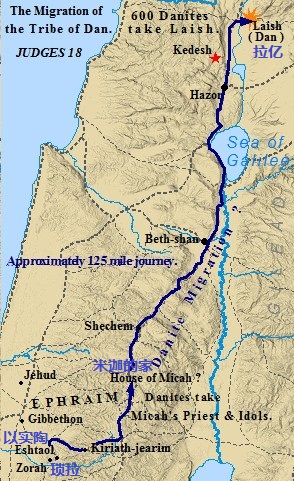 - 「拉亿」(7节)就是位于黑门山麓、约旦河源头的利善(书十九47),在琐拉和以实陶以北大约200公里,被但支派夺得后,改名为「但」。这里水源丰富、与世隔绝、防守薄弱,是最容易攻取和安居的地方。「如同西顿人安居一样」(7节),指西顿人不好战,而善于经商。「离西顿人也远,与别人没有来往」(7节),可能当地的居民是腓尼基人,但北面被黑门山与亚兰隔开,西面被黎巴嫩山与腓尼基人隔开。