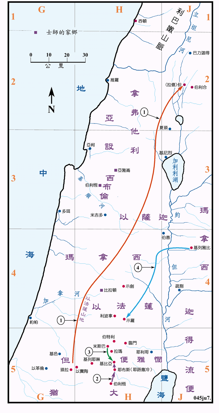 上图:但支派北迁、便雅悯支派险遭灭族:1、但支派攻取拉亿城,改名但城,在那里居住(士十八);2、一个利未人带着他的妾从伯利恆到了基比亚,在基比亚他的妾被辱致死(士十九1-28);3、以色列人集合在米斯巴,攻打基比亚,又烧杀了便雅悯的各城,便雅悯几被灭族(士十九29-二十48);4、以色列攻打基列·雅比,又将剩余的四百个处女带到示罗给便雅悯人为妻(士二十一9-12)。