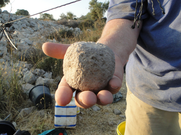 上图:在以拉谷附近的Khirbet Qeiyafa挖掘出来的主前10世纪机弦甩石(Sling Stone)。
