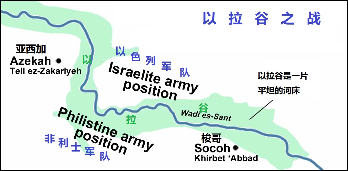 • 「以拉谷」(2节)是从迦特通往希伯仑和伯利恒的主要道路,两边是丘陵,两军隔谷对峙。「当中有谷」(3节),指有一条季节性的河道。