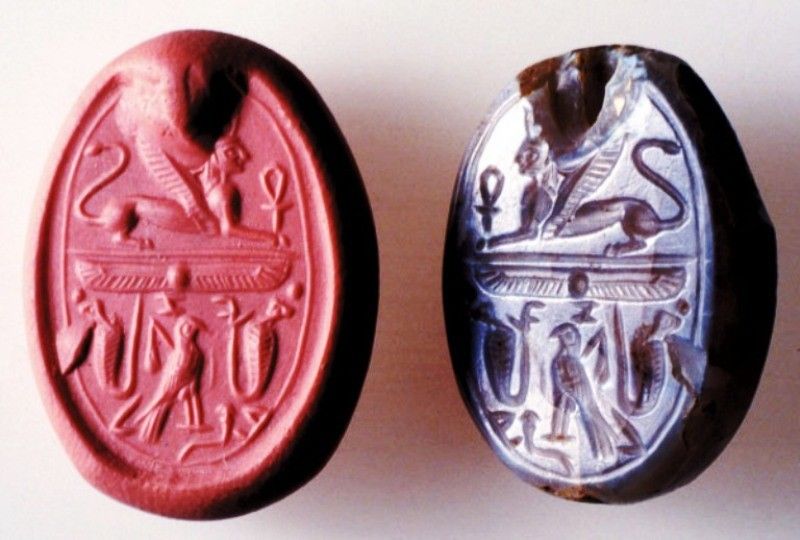 上图:1964年在以色列发现的耶洗别印章。这个印章是普通印章的两倍大,雕刻很复杂,顶部的损毁部分原来可能和写着Yzbl(属于耶洗别)。印章上包含着来自腓尼基和埃及的王家元素:戴着女王冠的带翅膀狮身人面像,代表埃及女王的两只眼镜蛇和猎鹰,代表埃及女王的莲花。这枚印章显示,耶洗别最后基本上篡夺了亚哈的权柄,完全控制了以色列。