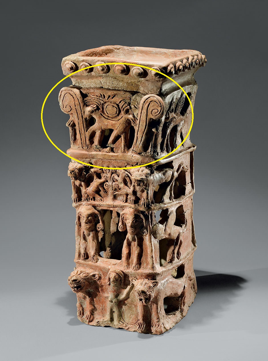 上图:以色列他纳出土主前10世纪祭台(Taanach Cult Stand),现存于耶路撒冷以色列博物馆。祭台的最下层是亚舍拉,左右各有一只狮子;第二层是两只牛犊;第三层是生命树;最上层是一匹背着带翼日轮的马,可能就是「向日头所献的马」(王下二十三11)。