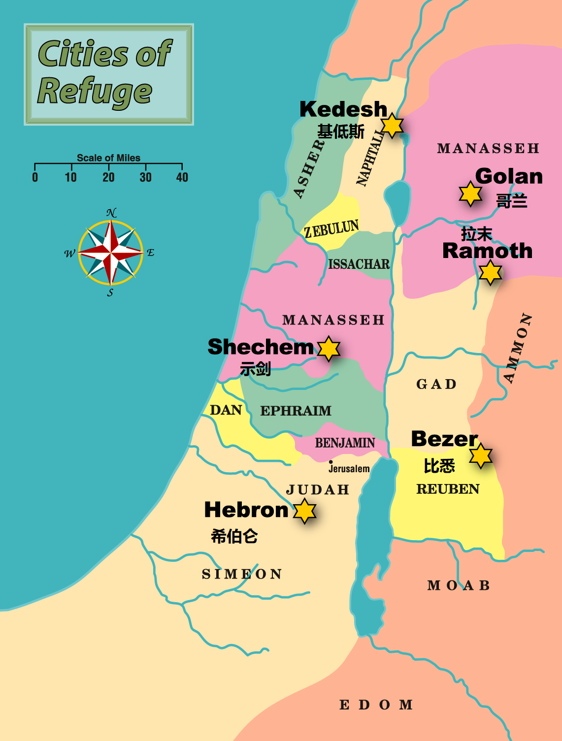 上图:六座逃城分布在十二支派之间,这样每一个地方的人都不会离附近的逃城太远。根据犹太传统,一般的大路只有16肘宽,但通往逃城的道路却有32肘,每个岔路都必须有明显的标识重复写上「逃城,逃城 ???? ????」。
