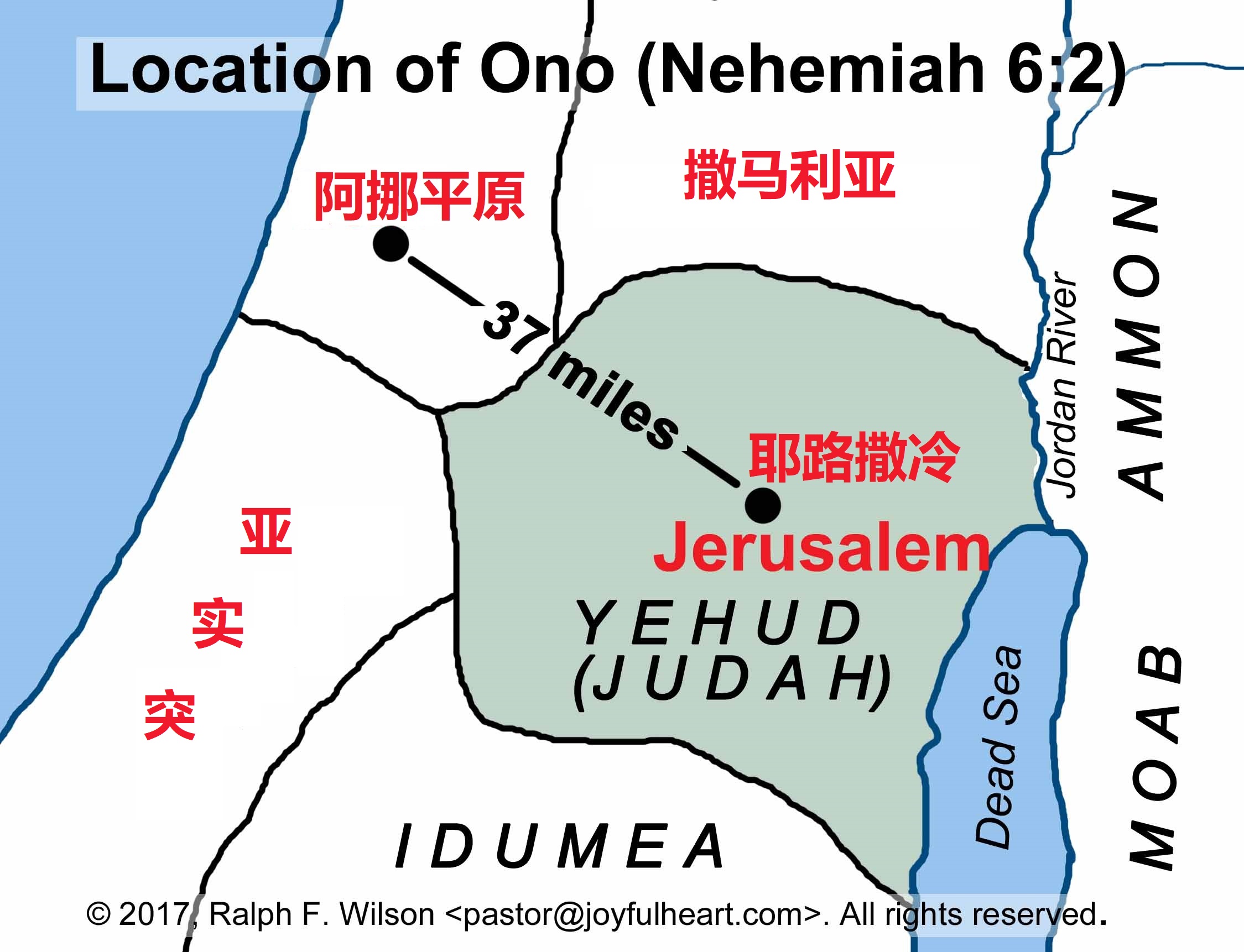- 「阿挪平原」(2节)可能位于耶路撒冷和撒马利亚的中间,离耶路撒冷大约有一天的路程。这里有回归的百姓居住(拉二33),参巴拉和基善选择这里会面,可能是想消除尼希米的戒心。