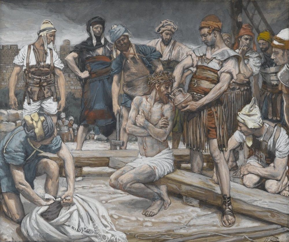 上图:绘画:「兵丁拿苦胆调和的酒给耶稣喝。祂尝了,就不肯喝」(太二十七34)。