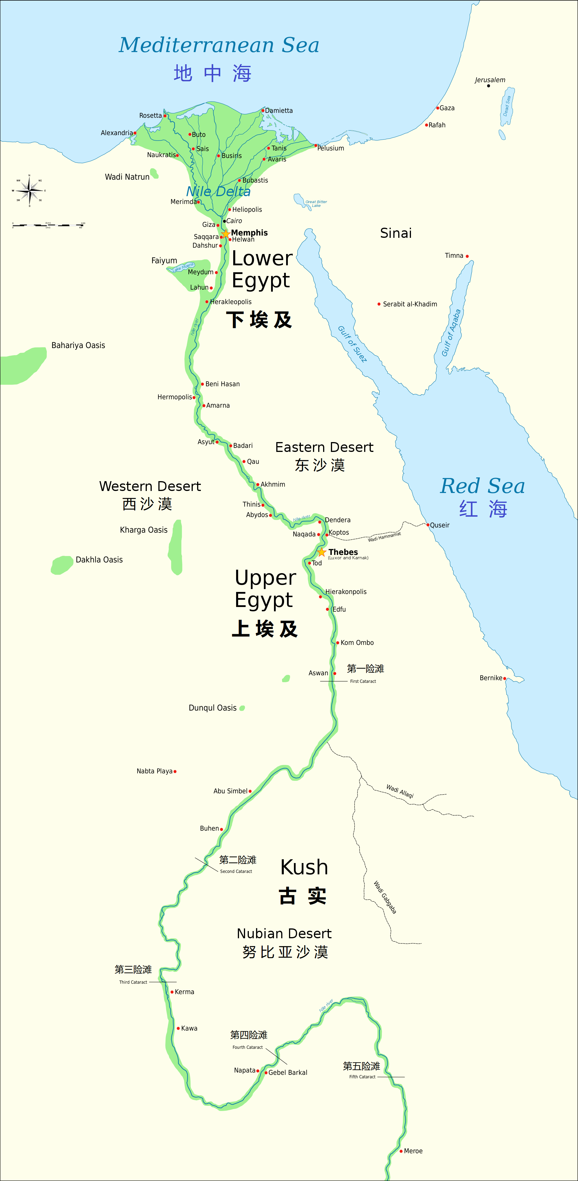 上图:尼罗河从南向北流经古实、上埃及、下埃及,将沙漠分开,并在地中海的入海口形成一个巨大的三角洲,所以说「他们的地有江河分开」(赛十八2)。几乎所有的古埃及遗址均位于尼罗河畔。从喀土穆(Khartoum)到阿斯旺(Aswan)之间的尼罗河有六大险滩,河水又浅又急,石头河床露出水面,在洪水季节之外无法航行。