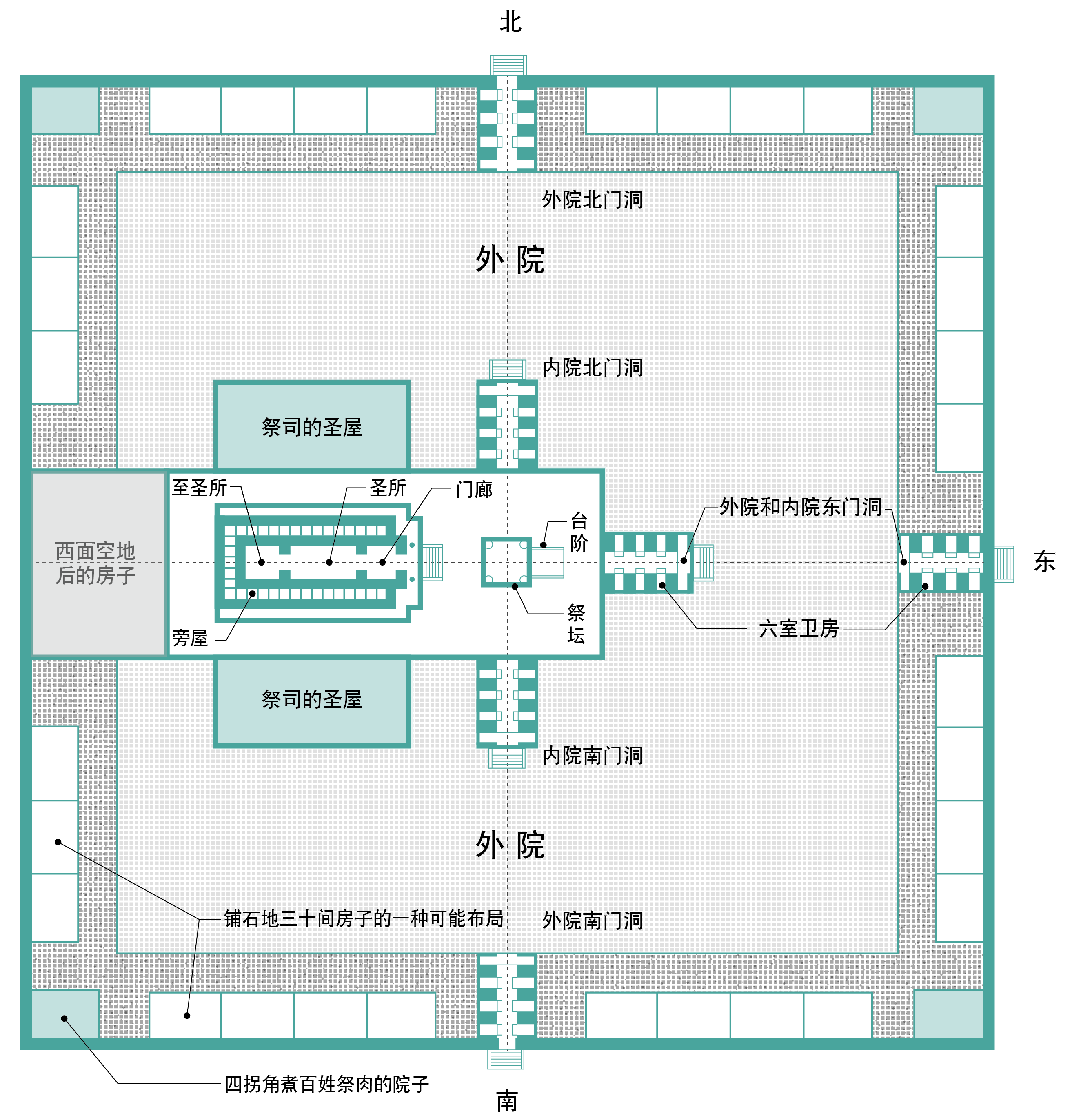 【结四十一11】「旁屋的门都向余地:一门向北,一门向南。周围的余地宽五肘。」