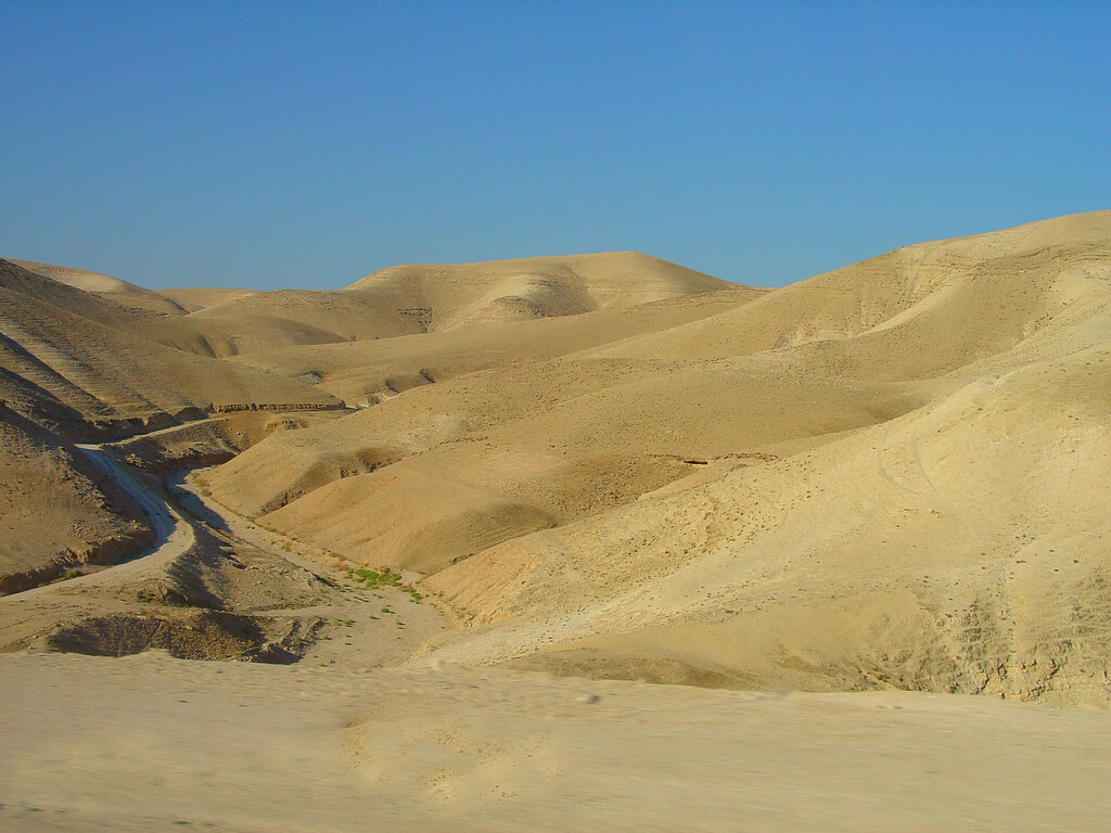 上图:犹大旷野位于犹大山地和约旦河谷之间。从橄榄山东面不远处开始就是绵延的山坡,草木稀疏,人迹罕至,从海拔900多米的犹大山地向东一直下降到海平面以下400多米的死海,南北约长100公里,东西宽约20-25公里。犹大旷野的地势由西至东下降约1300米,开始是许多平滑光秃的白垩山头连绵起伏,溪谷与沟壑纵横交错,靠近死海时逐渐变成陡峭的峡谷,到死海边成为嶙峋的悬崖。犹大旷野位于中央山地分水岭以东,地中海的雨云由西吹来,大部份雨水落在分水岭西面,分水岭东面的犹大旷野非常干旱,又有干燥的东风吹刮,雨季才偶尔有阵雨。在雨季的几个星期,干涸的旱溪(Wadi)中会激流奔涌,旷野中会长出少许植物。