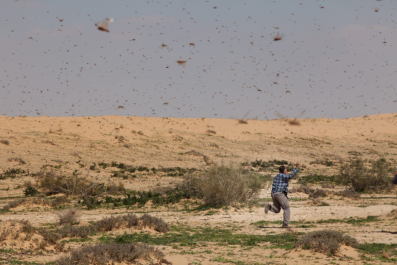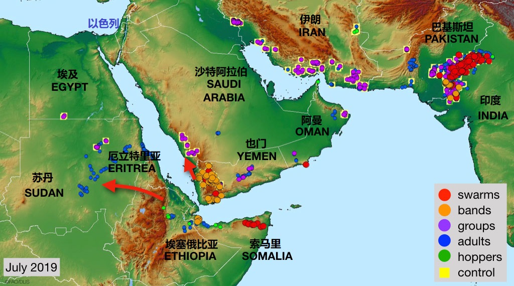 上图:2019年8月2日联合国粮农组织的中东沙漠蝗虫现状报告。沙漠蝗虫是中东常见的灾祸,会对农作物造成彻底的破坏。苏丹、埃塞俄比亚和也门一带繁殖的蝗虫,每隔10-15年就会爆发蝗灾,在二、三月间开始随着风向迁徙,袭击埃及、沙特、约旦和以色列。幸运的是,律法规定蝗虫是洁净的食物。