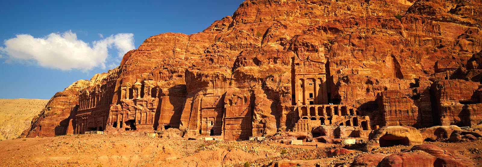 上图:凿山而建的佩特拉古城,现存的希腊、罗马式遗址几乎全部都是从岩石中雕凿出来的。主前6世纪,纳巴泰人驱逐以东人、占据了以东地,佩特拉成为纳巴泰王国的首都。佩特拉北通大马士革,南经亚喀巴湾可到印度洋和红海,西通加沙,东面穿过沙漠可到波斯湾,是古代贸易路线上的要塞。3世纪以后,可能由于萨珊波斯帝国的崛起和红海海上贸易的兴盛,作为陆路交通要塞的佩特拉渐渐衰落,7世纪被阿拉伯军队征服时,已是一座废弃的空城。