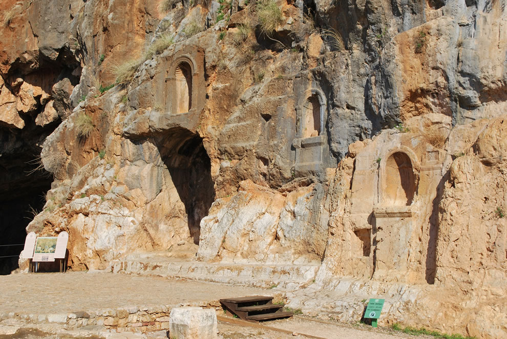上图:凯撒利亚腓立比遗迹,至今可见岩壁上刻着大大小小的偶像神龛。使徒彼得就在这偶像林立的地方认信基督(太十六13-16;可8:27-30;路9:18-21),在外邦假神中间承认主耶稣是「永生神的儿子」。