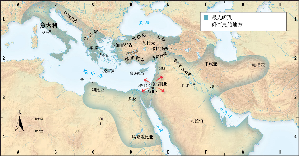 - 「但圣灵降临在你们身上,你们就必得着能力,并要在耶路撒冷、犹太全地,和撒马利亚,直到地极,作我的见证」(8节),这正是《使徒行传》记录历史事件的顺序:首先是圣灵降临(二章),然后是福音从耶路撒冷开始(二章起),接着传到犹太全地和撒马利亚(八、九章),最后遍及罗马帝国(十至二十八章)。