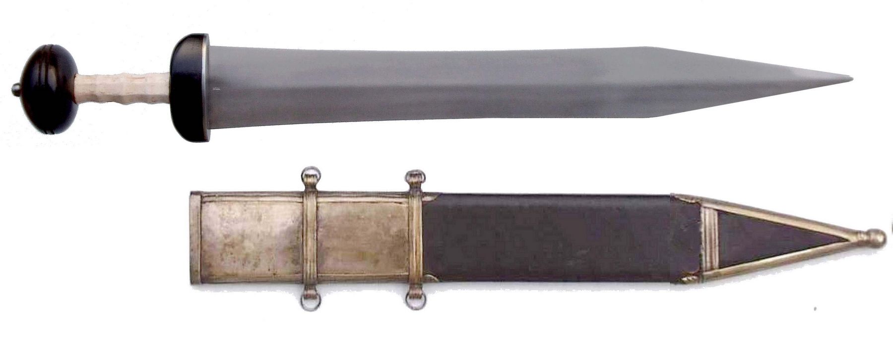 上图:新约时代罗马士兵使用的短剑Mainz Gladius,从西班牙引进。罗马军团士兵的标配是短剑、大盾、标枪和匕首。称霸千年的罗马军团采用方阵攻击战术,重步兵远距离投掷数轮标枪以后,再用短剑配合大盾近距肉搏,主要用于刺而不是砍,在密集的方阵中可以避免误伤队友。「剑」(启一16;二12、16;六8;十九15、21)原文(rhomphaia/?ομφα?α)在古希腊的文献中指色雷斯人从主前第四世纪开始使用的长柄单刃刀,刀片约60-80厘米,柄长约50厘米。但在古罗马的文献中,rhomphaia最初是指「矛」、后来是指「剑」(Plutarch: Life of Aemilius Paulus 18; Eustathius, on Iliad verse VI 166; Hesychius)。罗马军队使用的「剑」并非长柄单刃刀、而是双刃短剑。因此,《启示录》中「两刃的利剑」(启一16)并不是指希腊长柄单刃刀,而是指当时的读者最熟悉的罗马双刃短剑。
