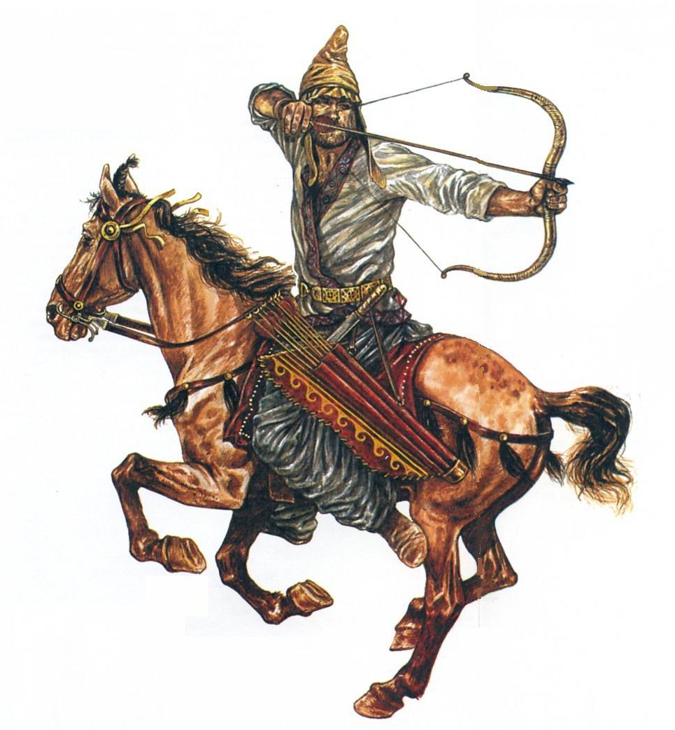 上图:帕提亚回马箭(Parthian Shot),又称安息回马箭,是一种由帕提亚人所发扬光大的弓骑兵战术。帕提亚人善于骑射,弓骑兵是安息帝国军中的主力。当年安息弓骑兵作战时广泛采用一种战术:于战场上佯作(或实际)撤退,引诱敌人(通常为骑兵)追赶。当敌人追至近身时,突然转身向身后的敌人发箭。由于距离较近,无须高超射术即可重创敌方。帕提亚人利用这一战术,在主前53年的卡莱战役(Battle of Carrhae)中战胜了罗马帝国。由于当时还没有发明马镫,骑手完全倚靠腿部的压力来引导马,所以这种战术需要精湛的马术技巧,后来主要在游牧民族的弓骑兵中普及。