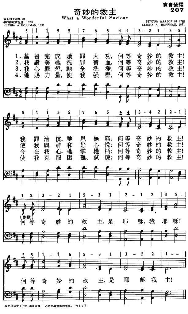 这首诗信徒皆爱唱颂,尤其是副歌“何等奇妙的救主!是耶稣我主”,几乎人人(包括不识字的老太太)会背,且已成为旅途蒙引、疾病得愈、忧伤得慰后见证奇妙恩主大能时赞美感谢的诗歌。