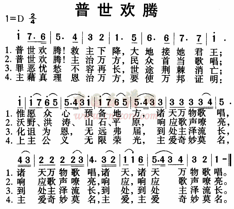 歌词: 普世欢腾!救主下降, 大地接她君王; 惟愿众心预备地方, 诸天万物歌唱, 诸天万物歌唱, 诸天,诸天万物歌唱。 普世欢腾!主治万方, 民众首当歌唱; 沃野洪涛、山石平原, 响应歌声嘹亮, 响应歌声嘹亮, 响应,响应歌声嘹亮。 罪恶忧愁不容再长, 世途荆棘消亡; 化诅为恩,无远弗届, 到处主泽流长, 到处主泽流长, 到处,到处主泽流长。 主藉真理恩治万方, 要使万邦证明 上主公义,无限荣光, 主爱奇妙莫名, 主爱奇妙莫名, 主爱,主爱奇妙莫名。 诗歌背景资料: 普世欢腾(Joy to the World)是最著名的圣诞颂歌之一,由格奥尔格·弗里德里希·亨德尔谱曲,以撒华滋作词。所要传达的信息是欢乐和爱取代了罪与忧愁。 在基督教诗歌史上,一位非常重要的人物——以撒华滋(Isaac Watts 1674~1748),被尊称为英国圣诗之父,因为他不但开启诗歌创作大门,也是将韵文诗篇转为近代圣诗的关键人物。 以撒华滋以他丰富多彩的圣诗创作,一扫当时英国教会的消沉气氛,振奋信徒群众的崇拜精神。他冲出原有的局限,更加全面深刻地领会圣经的内涵,写出了庄严雄伟的新歌,为基督教圣诗开辟了一条康庄大道。《普世欢腾》是他的代表作;他以新约的语言,仿写旧约的诗篇。他根据诗篇第98篇1、3、6等节写成第一节、第二节,然后加上一段基督教的福音信息:“化诅为恩,无远弗届,到处主泽流长。”以后又回到诗篇第98篇第9节。“因为他来,要审判遍地。他要按公义审判世界,按公正审判万民。” 诗篇九十八篇是一篇赞美的诗篇。赞美、庆贺上帝的荣耀。因为上帝以信实不变的爱,拯救以色列人,让世人都看见他奇妙救恩。所以全地都要一起发声赞美,用各样乐器,连众山和大海,都要一起欢呼。 以撒华滋将这样充满喜悦的诗篇,重新诠释为上帝的救恩,是差派主耶稣来到世上,道成肉身,降生于伯利恒,是为了爱,为要救赎人类。 这首诗歌一共有四节。第一与第二节,都是以Joy to the world,普世欢腾为开场,充分表现出对于主耶稣诞生的热诚喜悦。所有被造万物,都要一起歌唱,欢喜迎接救主降临。第三节传达救主深厚的爱与带来的祝福,代替了罪恶与忧愁。而第四节则是再次言明上帝的爱与恩惠真是奇妙无比。 整首诗歌都充满对救主的欢迎、感恩与赞叹。难怪有人要说,再也没有别首圣诗像《普世欢腾》一样,能够如此清楚表达出庆祝救主降生所感受到的快乐。 歌谱: 9月5日 每日恩典内容 每日读经 | 历代志下14章 每日读经| 历代志下15章 每日读经 | 诗篇20篇 每日读经 | 提摩太前书1章 每日经历神 | 9月5日 白白舍去 恩典365 | 9月5日 受难周系列:照着神的话语而行就必蒙福 竭诚为主 | 9月5日 传道者的警醒 赞美诗 | 普世欢腾 如何为丈夫祷告 | 15他的名声