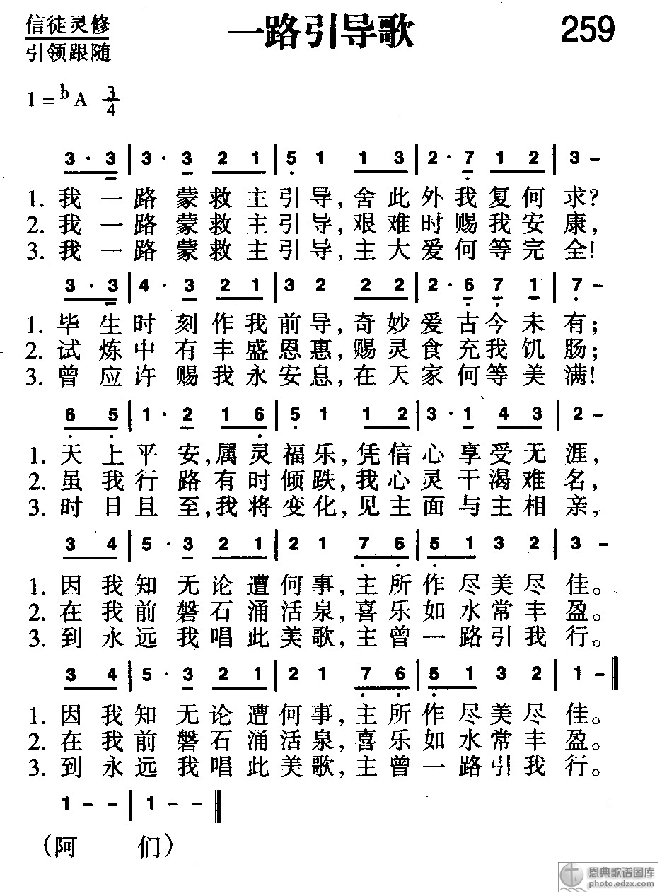 歌词: 词/Fanny J.CRPSBY 曲/Robert LOWRY 歌词: 我一路蒙救主引导,一切别事何必求? 岂能疑惑耶稣爱怜,一生危险主拯救; 天上平安圣灵安慰,都从信心可以得! 因我深知凡事临我,主能使我获大益。 我一路蒙救主引导,弯曲路为我指明, 赐我力量忍受试炼,降下天粮养灵命; 虽然行路我时疲倦,我的心干渴可怜, 在我眼前有灵磐石,乐哉是我欢喜源。 我一路蒙救主引导,想主怜爱何等深! 主曾应许满足平安,为我天家之福分; 等我变化得着荣体,升到天上光明所, 我要永远唱此美句:耶稣一路引导我。 诗歌背景资料: 这是芬尼所写的最好的诗歌之一,最能代表她一生的经历,和她诗歌突出的特点。每一节都说到在救主引领之下,我们行走主道路的甜美经历。但在这首诗歌的背后,却是藏着走主道路时,我们常是遇见危险、挫折、损失、艰难(一节),并且有时候是寂寞、干渴,一次又一次的痛苦和打击使我们天然生命无法忍受(二节)。但这条路并不会太长,我们不能盼望在今生走主道路时能避开这些难处。一切事都在主的引领中,对我们都是最大的益处(三节)。在这样艰苦的环境中,她却一直用正面笔法来写主甜美的恩典。 5月27日 每日恩典内容 每日读经 | 申命记26章 每日读经 | 申命记27章 每日读经 | 诗篇90篇 每日读经 | 使徒行传1章 每日经历神 | 5月27日 神的法则 恩典365 | 5月27日 把握机会系列:倚靠神才能站立得稳 竭诚为主 | 5月27日 活的生命 赞美诗 | 一路引导 受浸辅导课程——3.圣礼与节期(2) 读经马拉松 | 出埃及记40章(英语)
