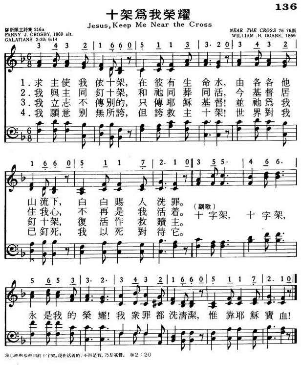 这首诗是美国盲女诗人芬妮、克罗斯比(Fanny Crosby,1820-1915)所写的优美的诗歌之一。它是先由杜恩(William H.Doane 1832-1916)谱好了曲调,再请她作词。词曲配合的很好,所以把调名称为《十字架》。她在生下来6个星期时,眼睛发炎,当地眼科医生不在,临时找了另外一个人来治疗,那人主张以药膏来热敷,没想到就这样把她的双眼都弄瞎了。在她后来的传记里,她提到有一位弟兄可怜她的情况,以为她对自己从6个星期大就失明一定有很多的自卑、自怜、怨恨。但她告诉那位弟兄,“我巴不得我一生下来就是瞎子”。他非常不解地问道:“为什么呢?”她回答:“这样,当我有一天到主那里时,第一位我眼睛能看到的就是我的主耶稣。”