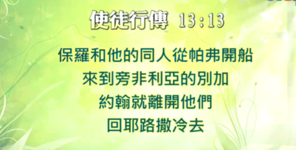 使徒行传 13:13 保罗和他的同人从帕弗开船,来到旁非利亚的别加,约翰就离开他们,回耶路撒冷去。