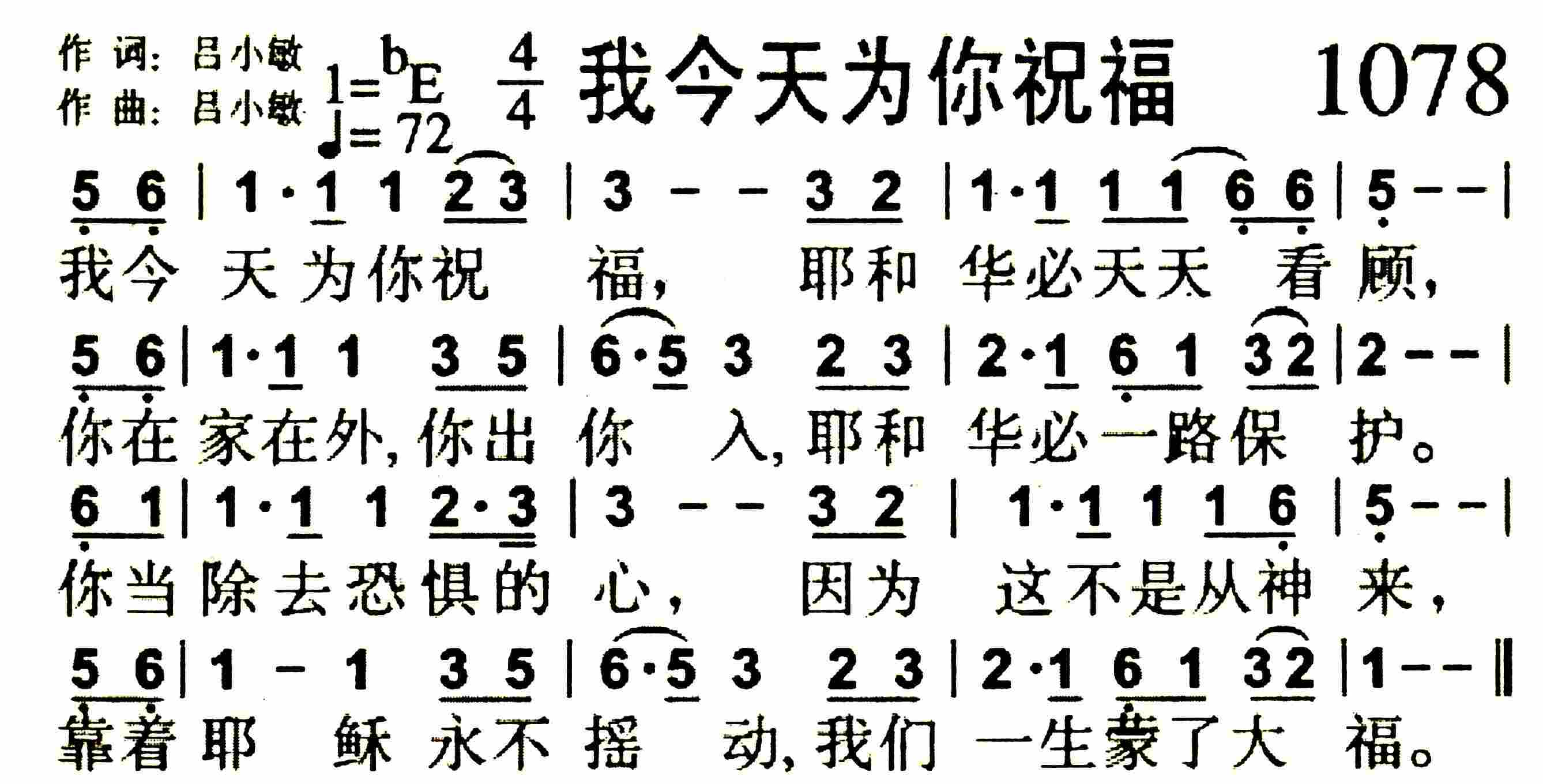 我今天为你祝福 耶和华必天天看顾 你在家在外 你出你入 耶和华必一路保护 你当除去恐惧的心 因为这不是从神来 靠着耶稣 永不摇动 我们一生蒙了大福