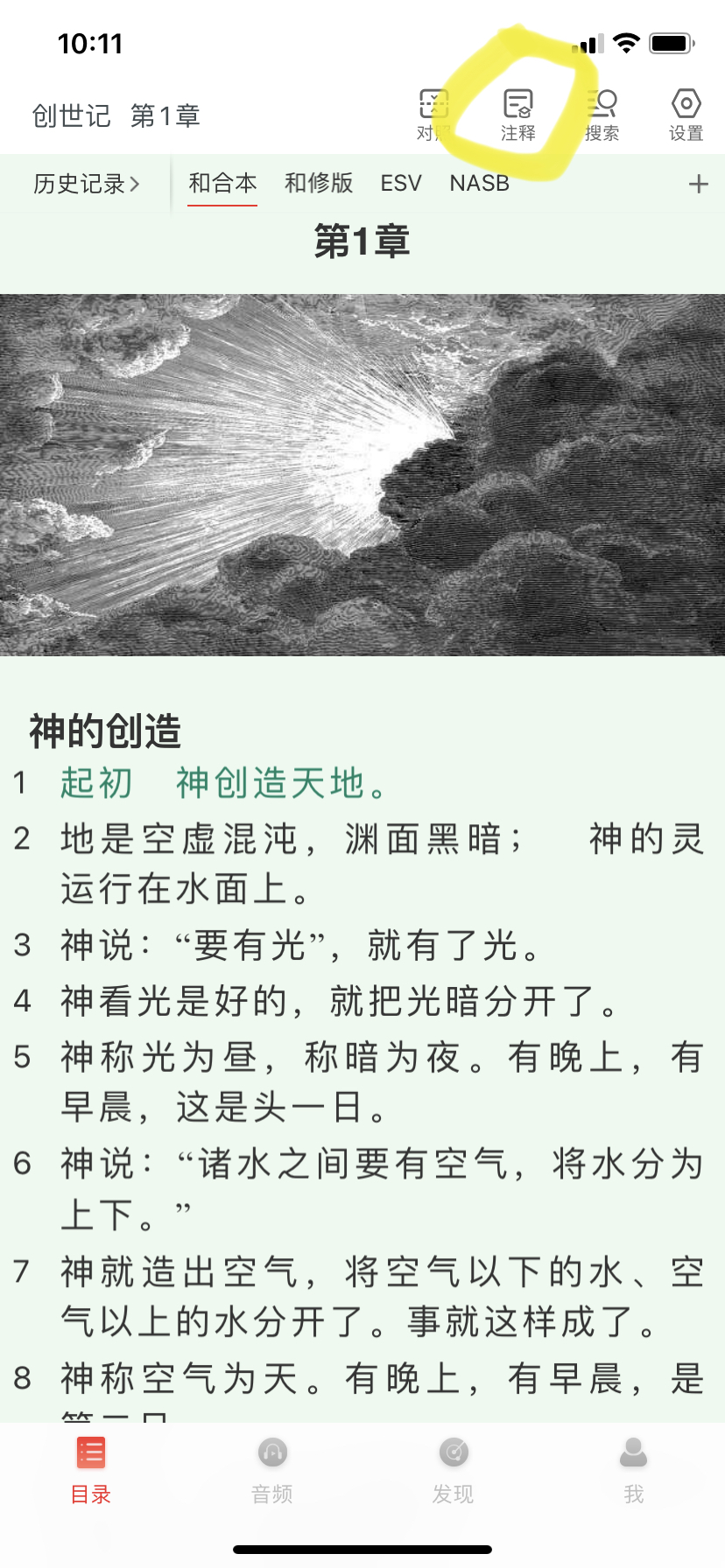 以下是「主内圣经」的主画面,请首先点击上方的「注释」,选择想要的注释: