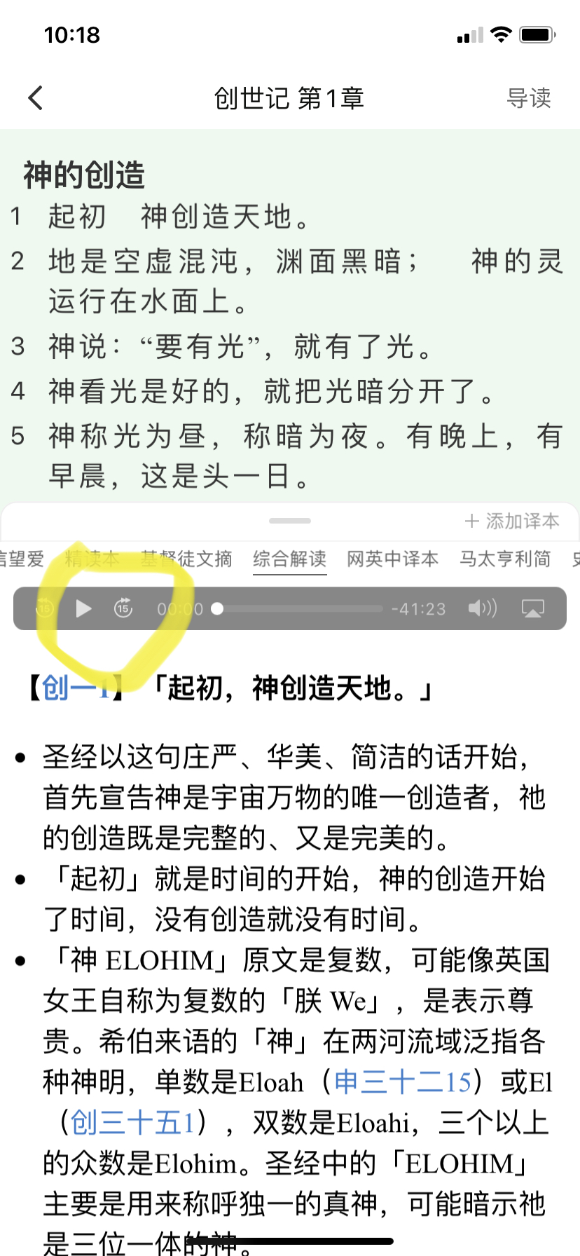 安装注释之后,下次再点击主画面上方的「注释」,就可以阅读《圣经综合解读》。但这个界面里的朗读和图片还是需要联网,离线下载音频参见步骤5: