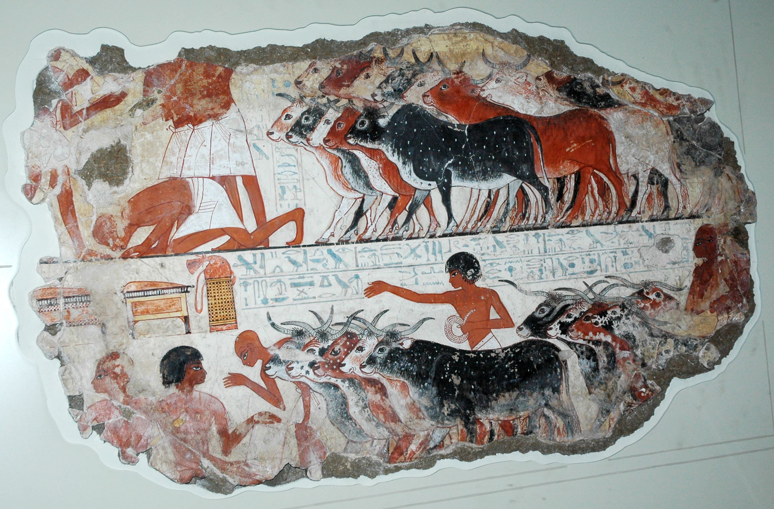上图:主前1350年埃及壁画上的牛,现藏于大英博物馆。古埃及的牛没有隆起的背,有两只伸展的大角。古埃及人通常把牛放在不适合耕种的草场牧养,这些草场位于远离尼罗河或灌溉系统的地方,或者是潮湿的尼罗河三角洲。古埃及人用牛来耕种、献祭,并获取肉、奶和皮。许多埃及神祇都以牛的形象出现,如Hathor、Ptah、Menthu、Atum-Ra。